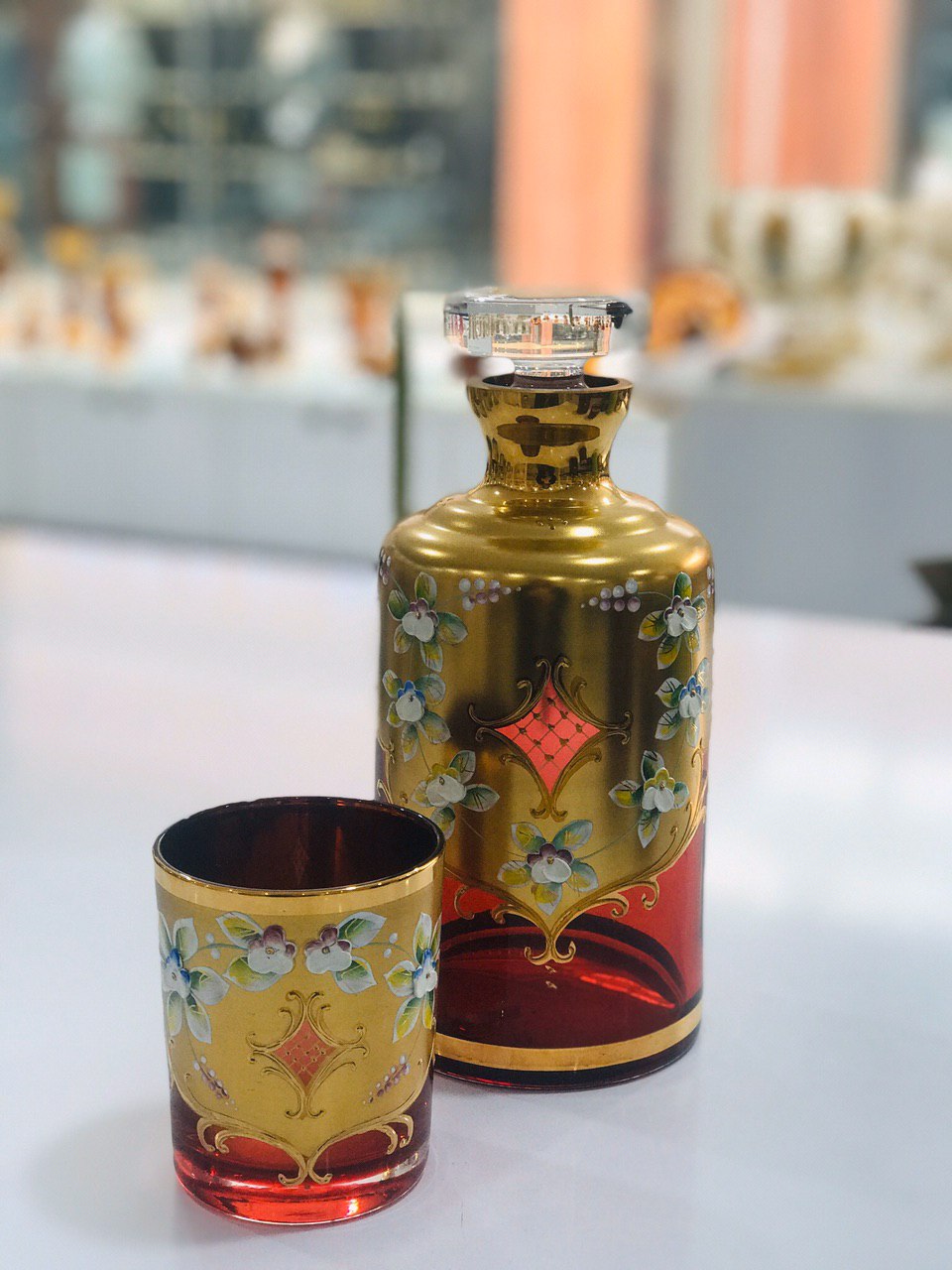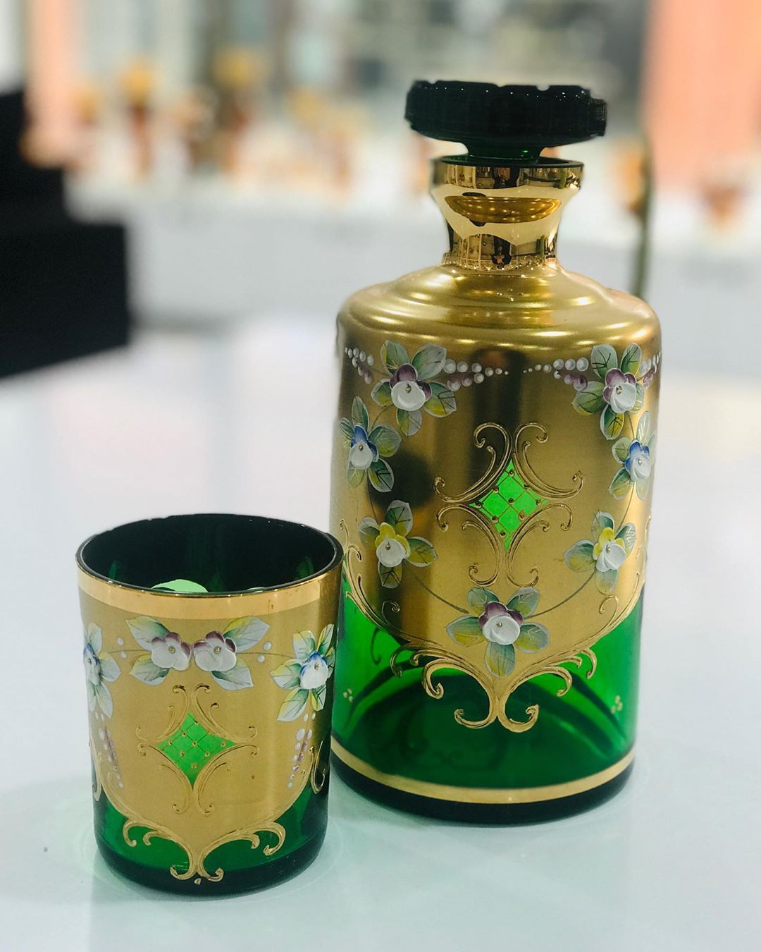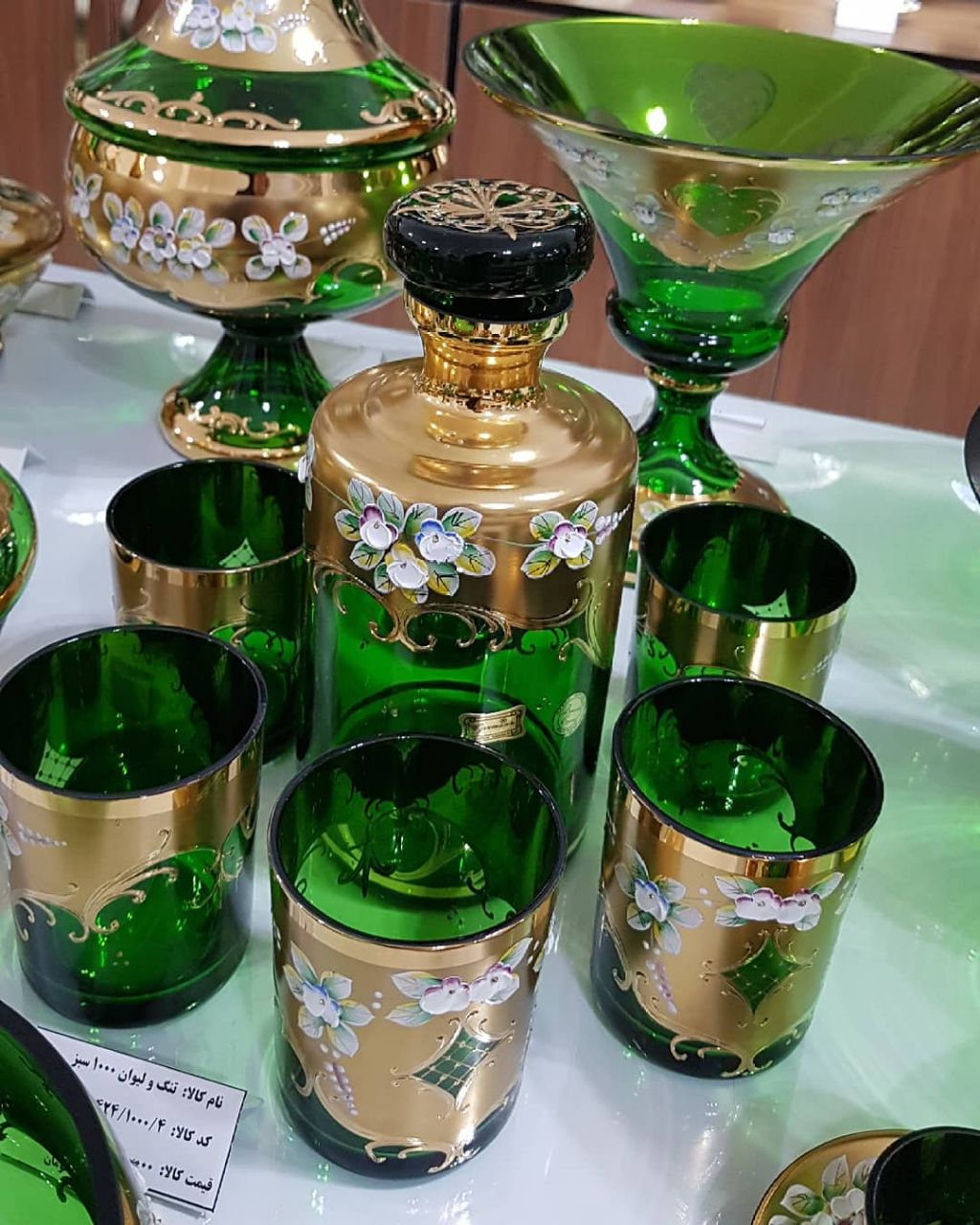 تنگ و ۶ لیوان اگرمن . برندegermann . ساخت کشور چک . تماما دستساز و طلاکوب شده . موجود در رنگهای سبز ، قرمز ،…. .